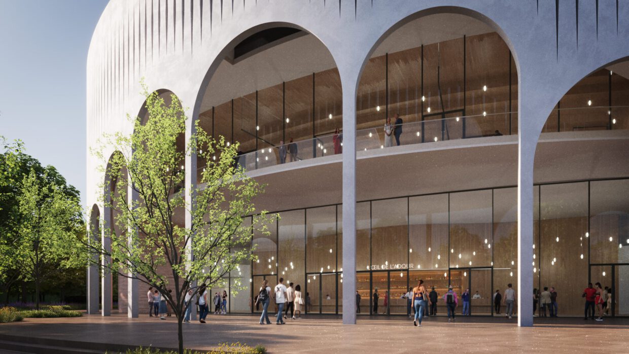 Atelier Ferret’s winning design for the Grand Dax multipurpose performance hall in Dax, France, creates a dynamic and timeless presence: a pure cylindrical volume that dialogues with the historic bullring and the Parc des Arènes while opening views to the Adour river. The two-layer façade reinterprets local Art-Deco motifs in a contemporary language. Inside, a high-performance, bioclimatic venue delivers high flexibility for concerts, congresses, exhibitions and sporting events.